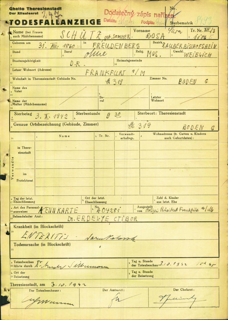 Schütz Rosa: Oznámení o úmrtí, ghetto Terezín
