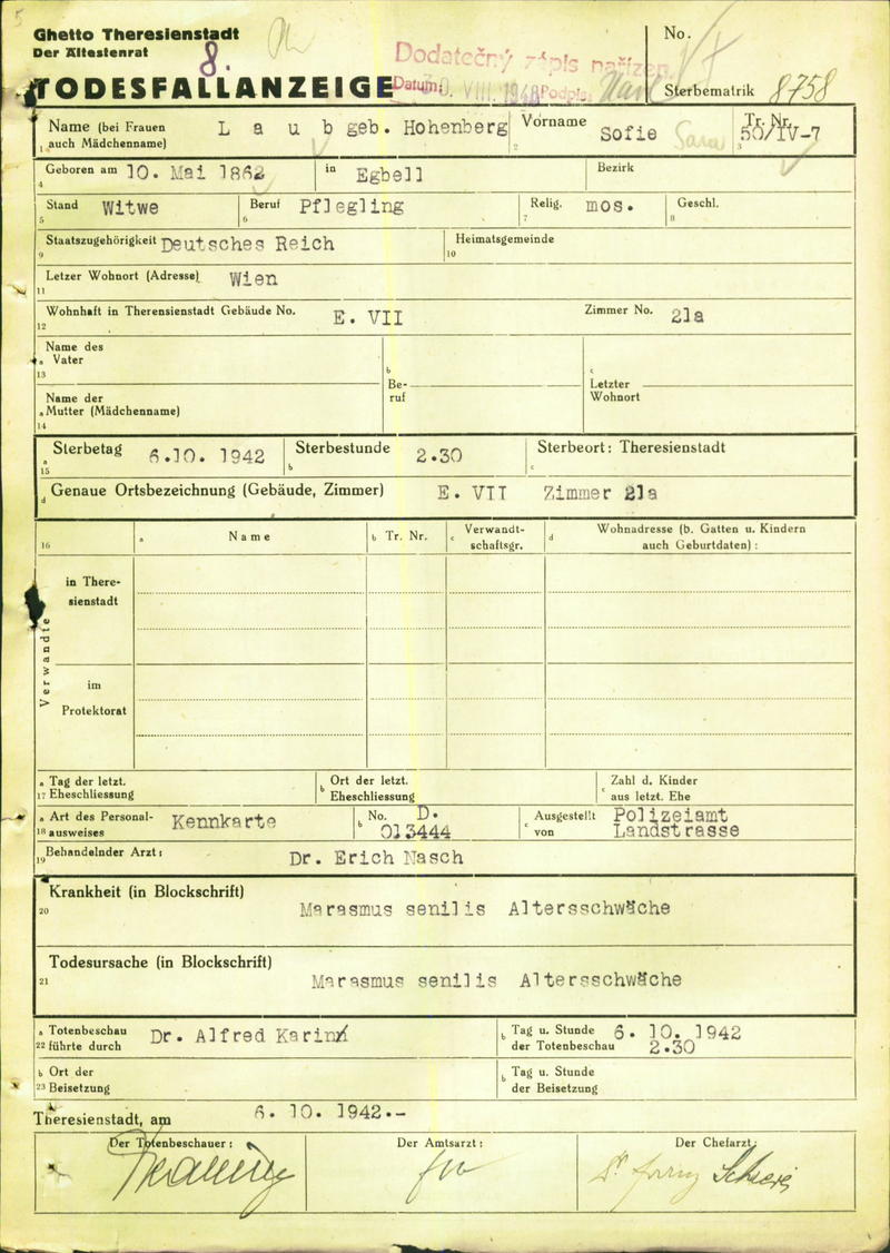 Laub Sofie: Oznámení o úmrtí, ghetto Terezín