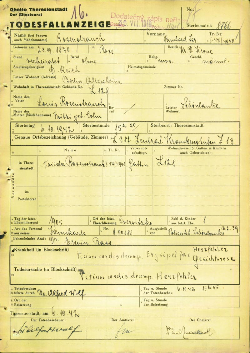 Rosenstrauch Bernhard: Oznámení o úmrtí, ghetto Terezín
