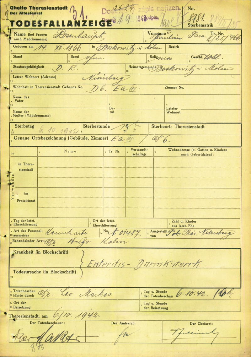 Rosenhaupt Pauline: Oznámení o úmrtí, ghetto Terezín