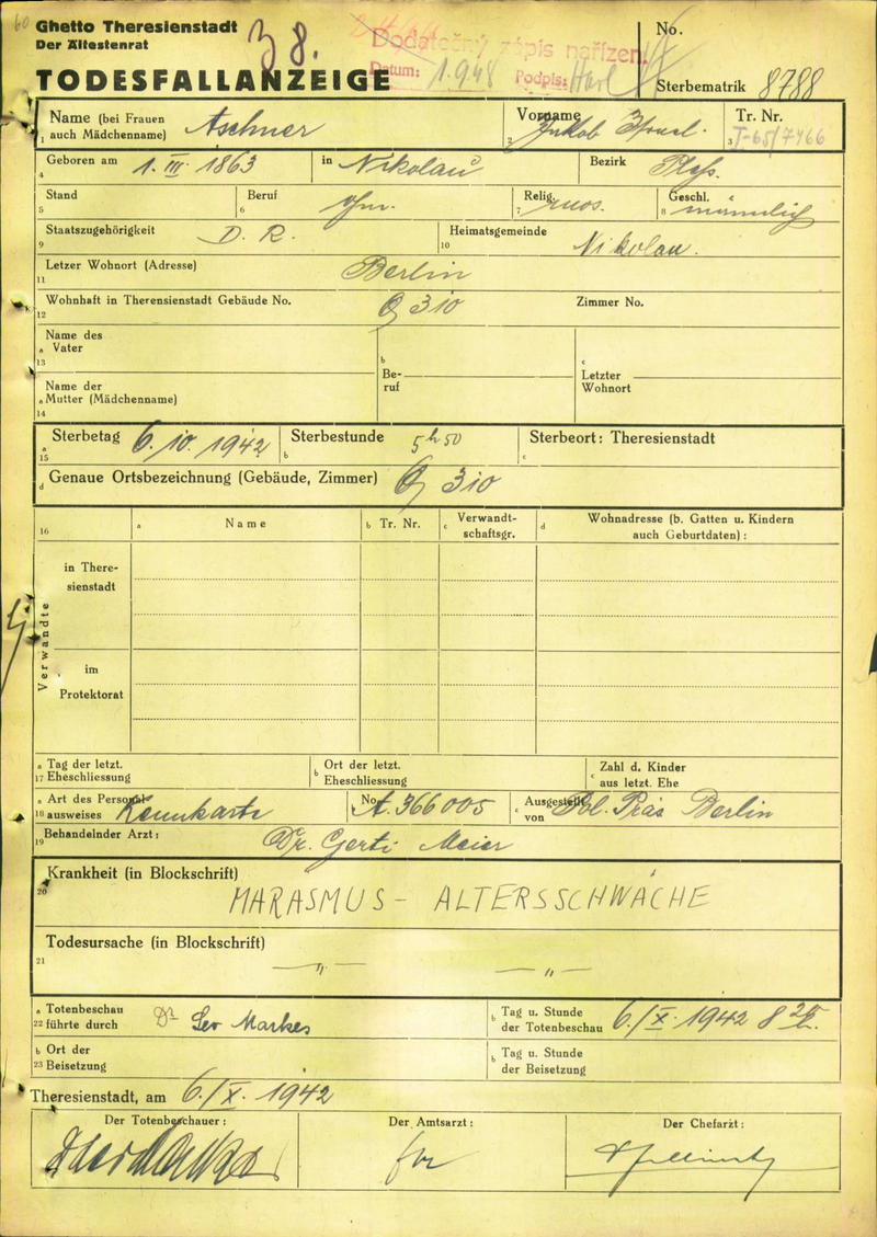 Aschner Jacob: Oznámení o úmrtí, ghetto Terezín