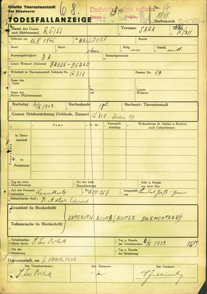 Reiss Sara: Oznámení o úmrtí, ghetto Terezín