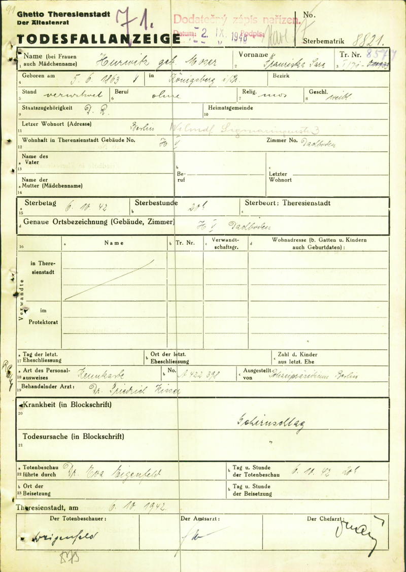 Hurwitz Franziska: Oznámení o úmrtí, ghetto Terezín