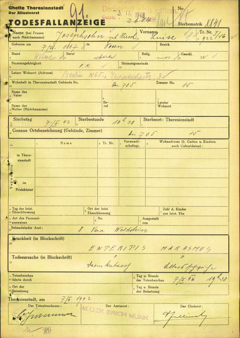 Josephsohn Luise: Oznámení o úmrtí, ghetto Terezín