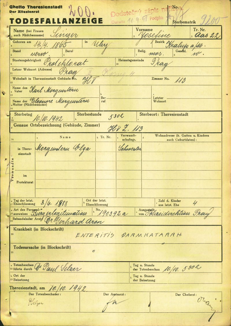 Singerová Josefa: Oznámení o úmrtí, ghetto Terezín
