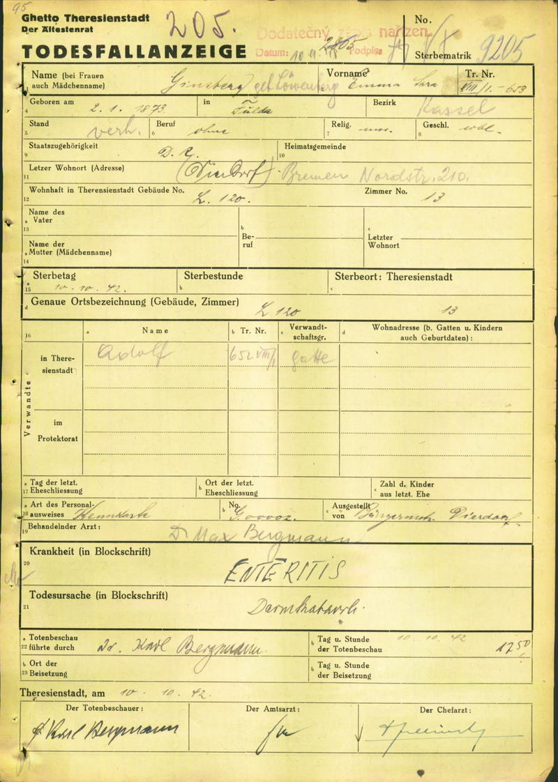 Ginsberg Emma: Oznámení o úmrtí, ghetto Terezín