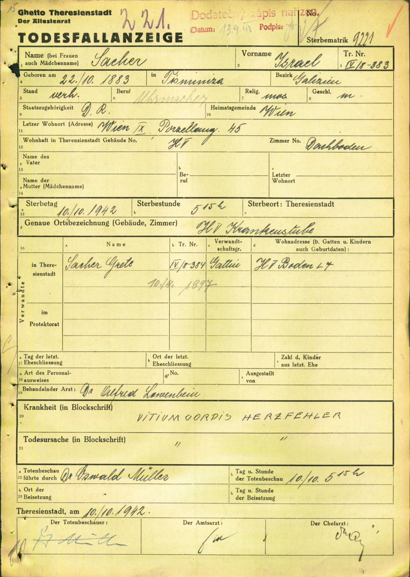 Sacher Israel: Oznámení o úmrtí, ghetto Terezín