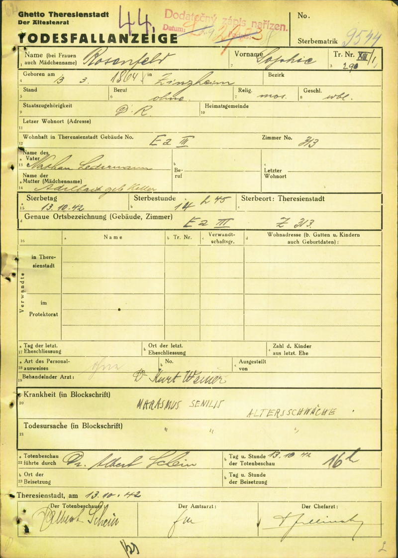 Rosenfeld Sophie: Oznámení o úmrtí, ghetto Terezín