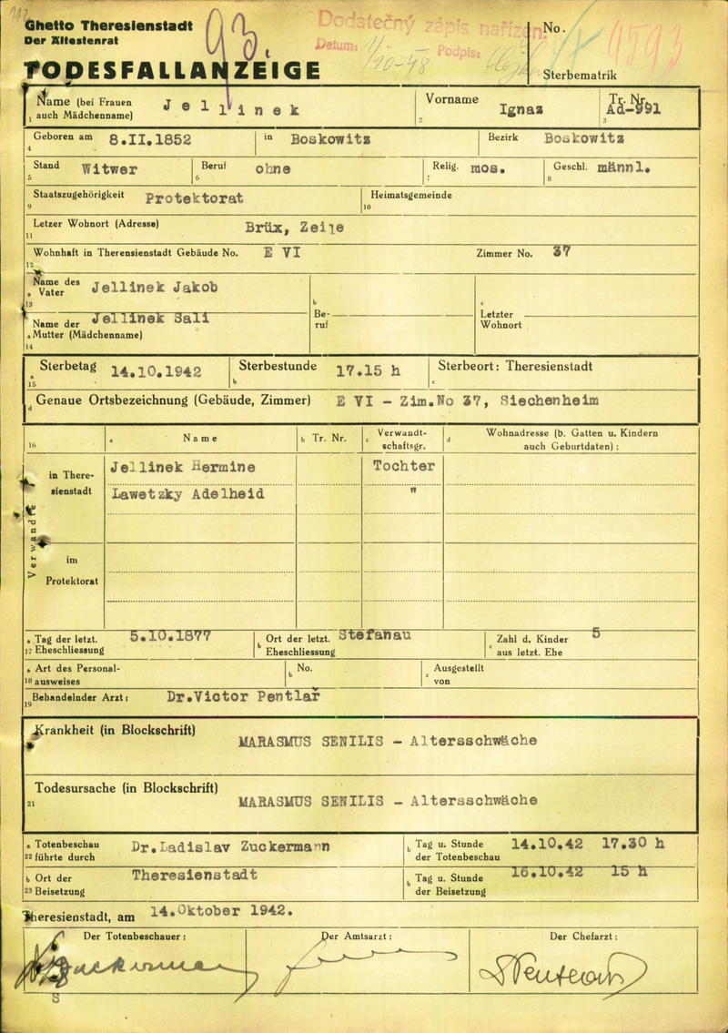 Jellinek Hynek: Oznámení o úmrtí, ghetto Terezín