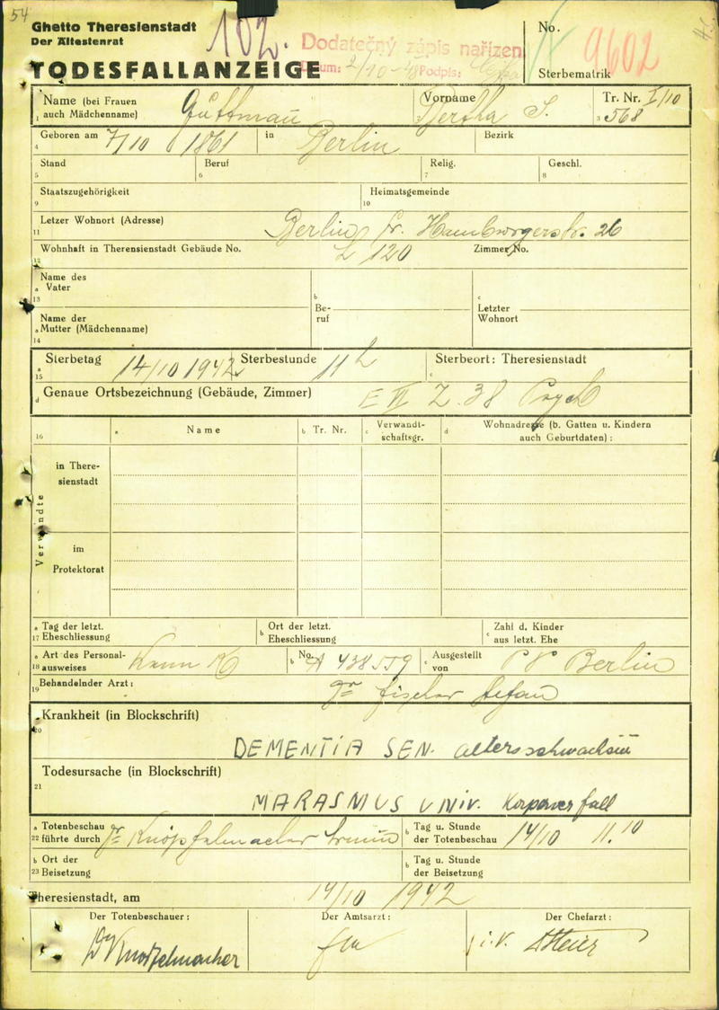 Guttmann Bertha: Oznámení o úmrtí, ghetto Terezín