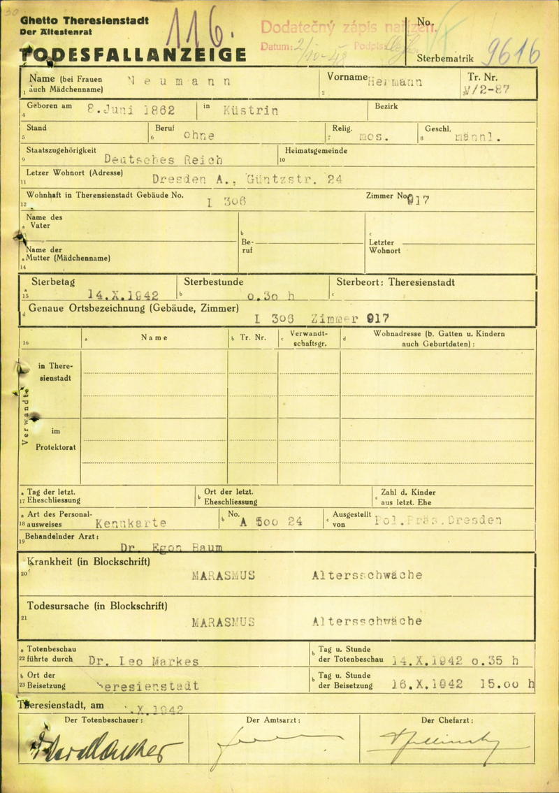 Neumann Hermann: Oznámení o úmrtí, ghetto Terezín