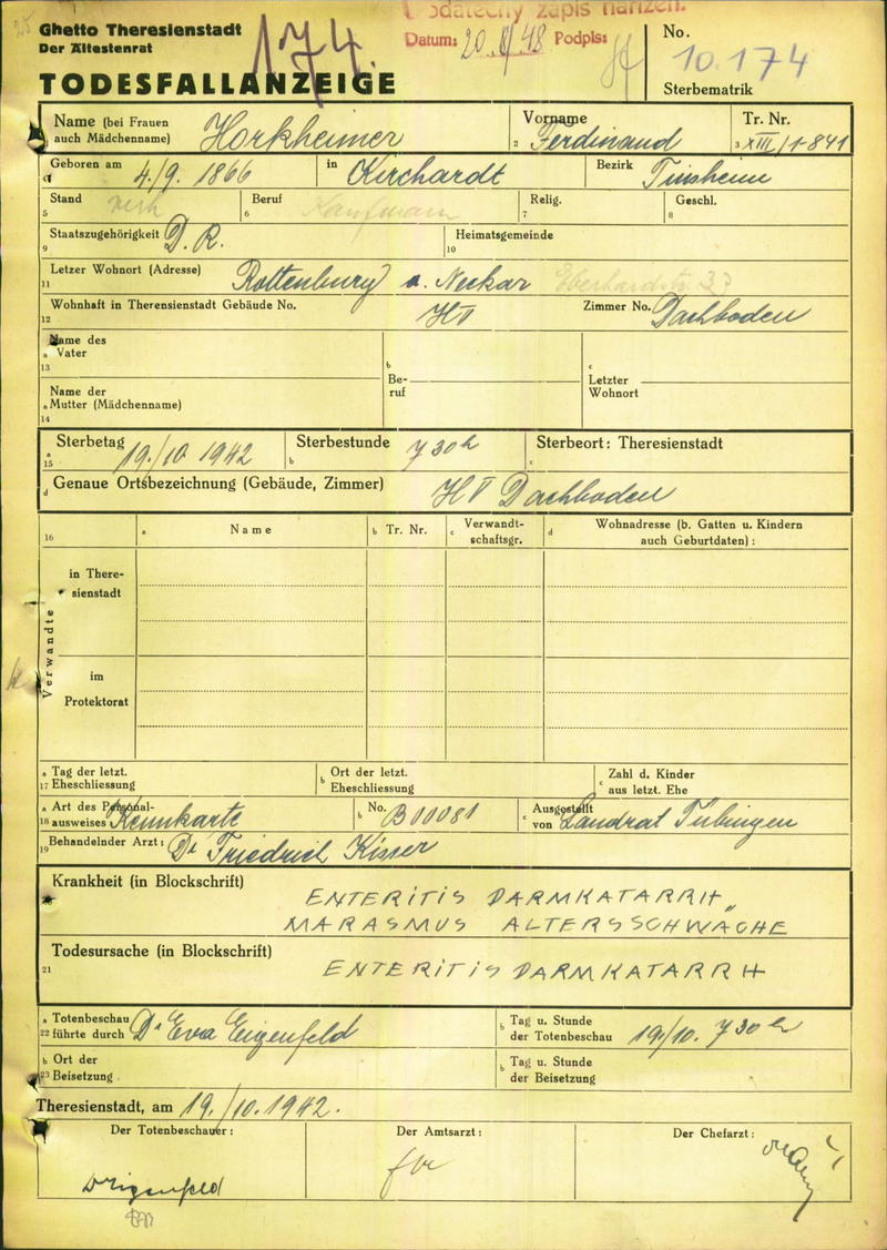 Horkheimer Ferdinand: Oznámení o úmrtí, ghetto Terezín
