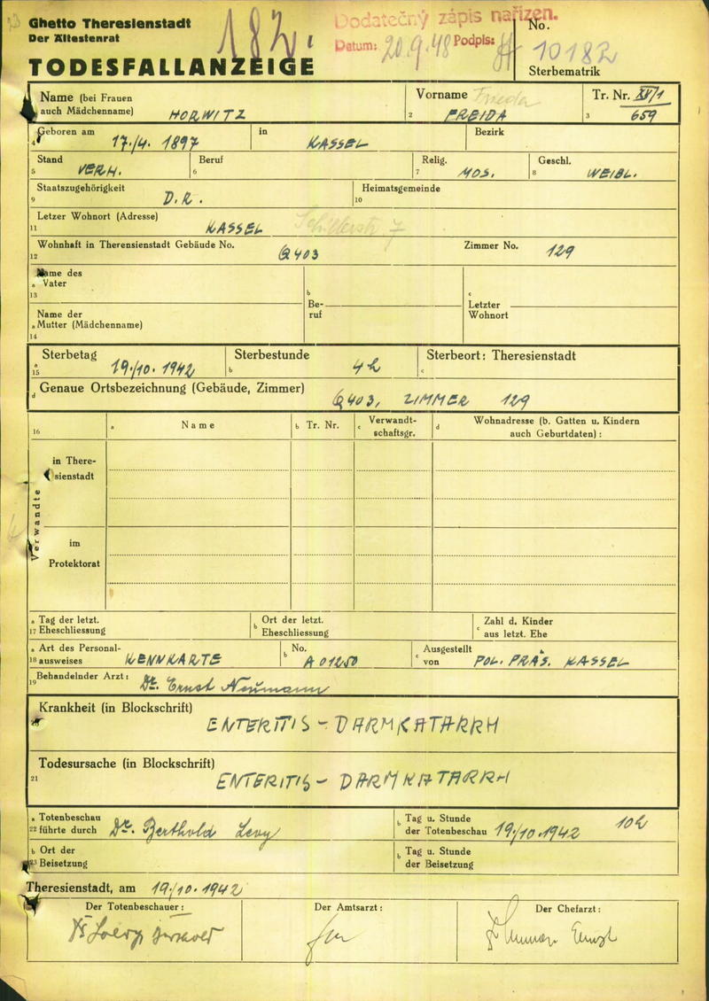 Horwitz Frieda: Oznámení o úmrtí, ghetto Terezín