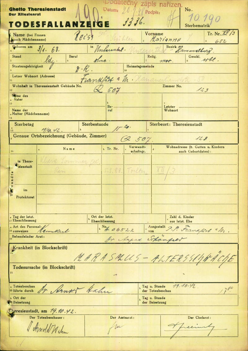 Reis Marianne: Oznámení o úmrtí, ghetto Terezín
