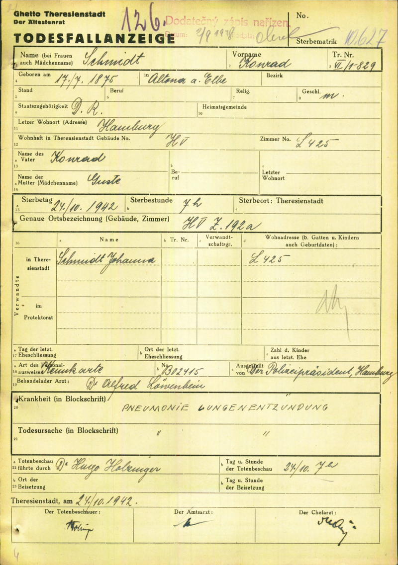 Schmidt Konrad: Oznámení o úmrtí, ghetto Terezín