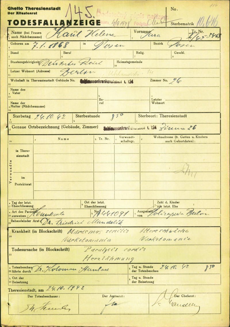 Kaul Helene: Oznámení o úmrtí, ghetto Terezín