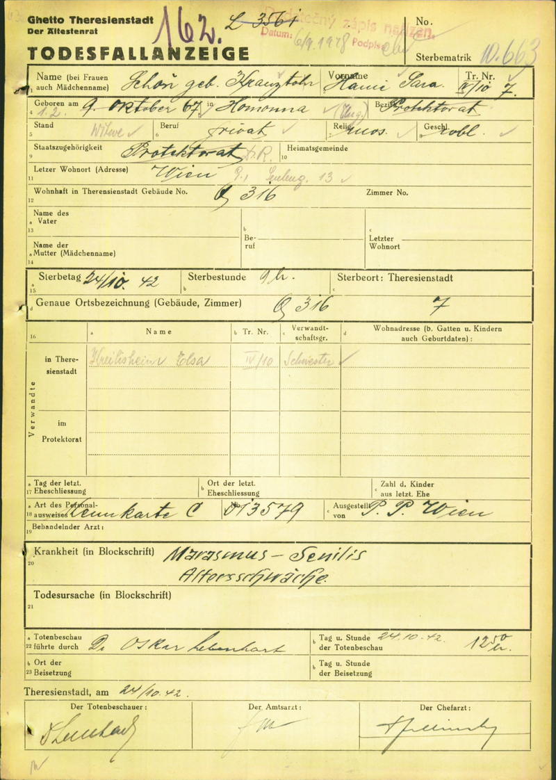 Schön Hanie: Oznámení o úmrtí, ghetto Terezín