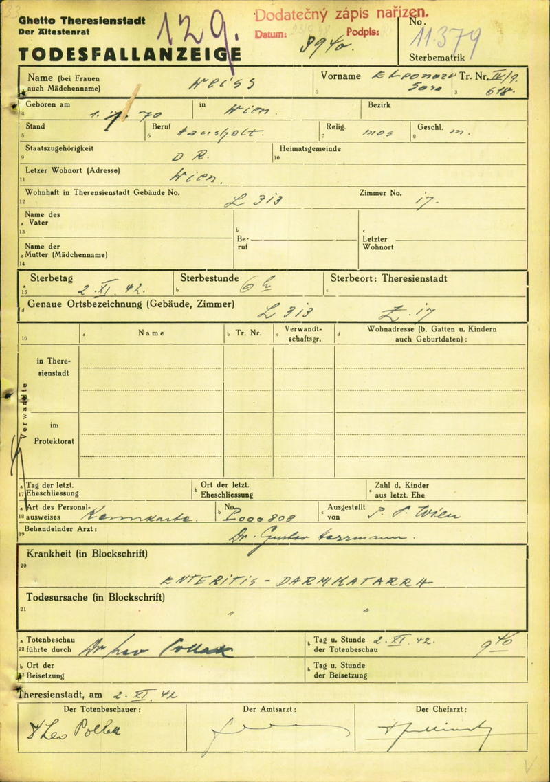 Weiss Eleonore: Oznámení o úmrtí, ghetto Terezín