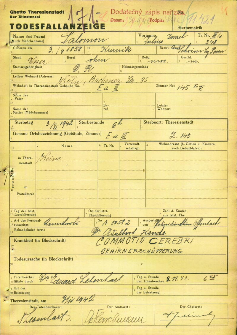 Salomon Julius: Oznámení o úmrtí, ghetto Terezín