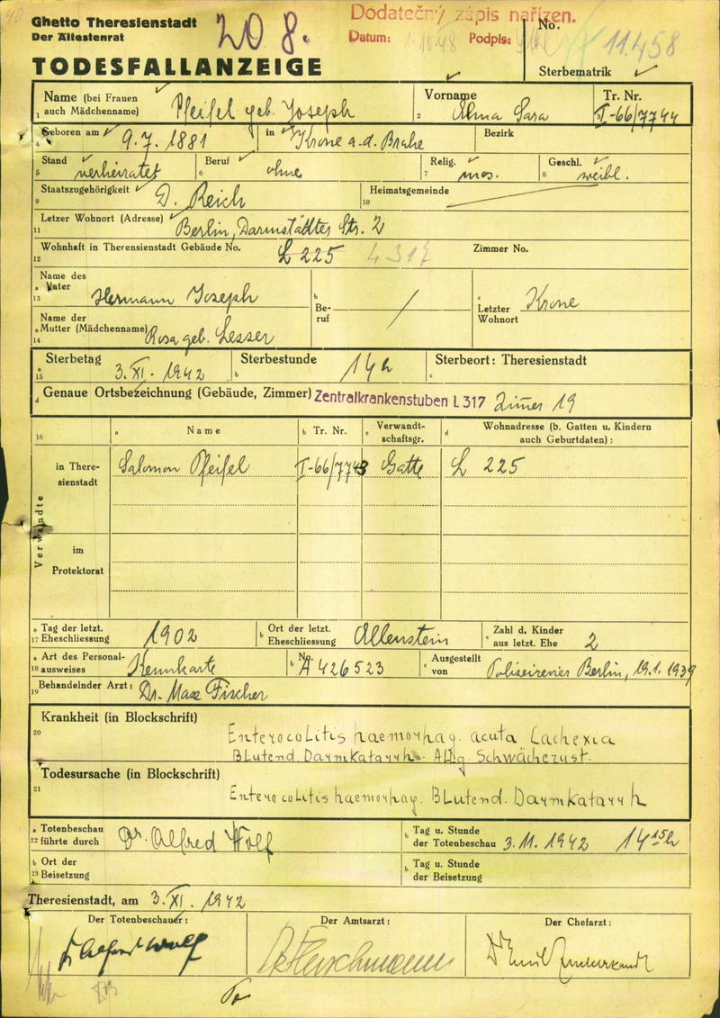 Pfeifel Alma: Oznámení o úmrtí, ghetto Terezín