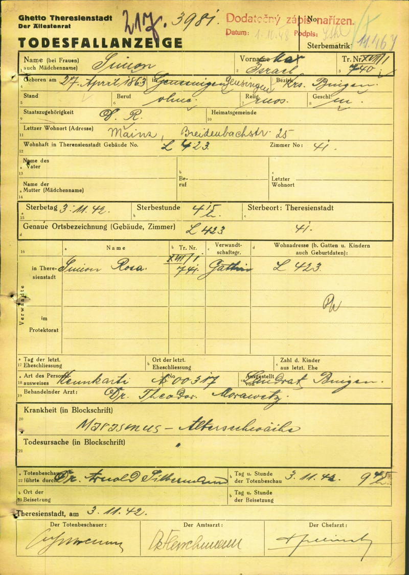 Simon Max: Oznámení o úmrtí, ghetto Terezín