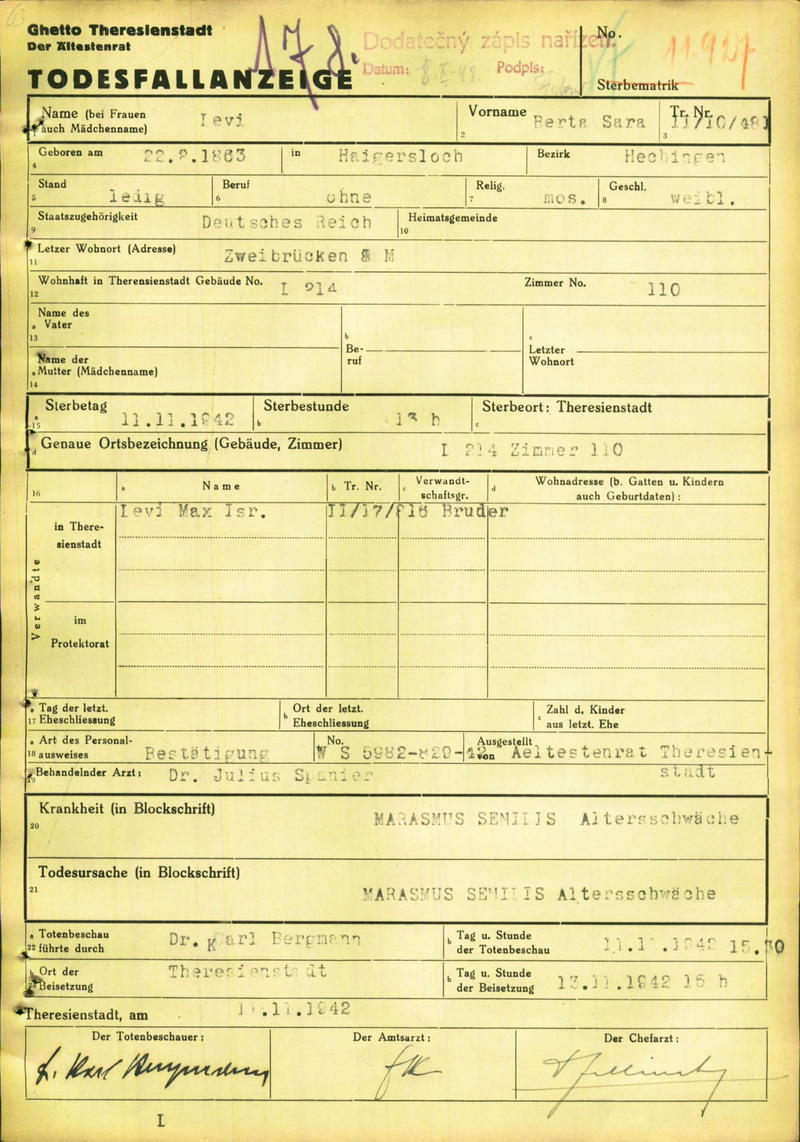 Levi Berta: Oznámení o úmrtí, ghetto Terezín