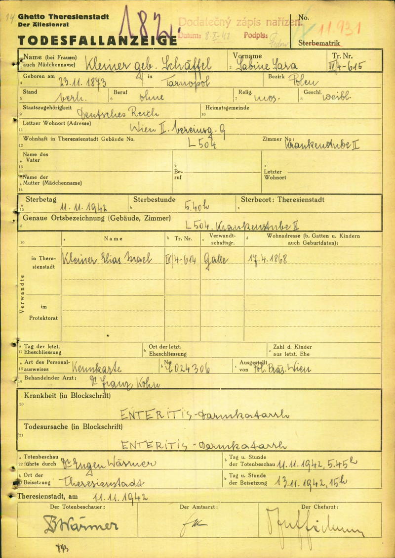 Kleiner Sabine Scheindel: Oznámení o úmrtí, ghetto Terezín