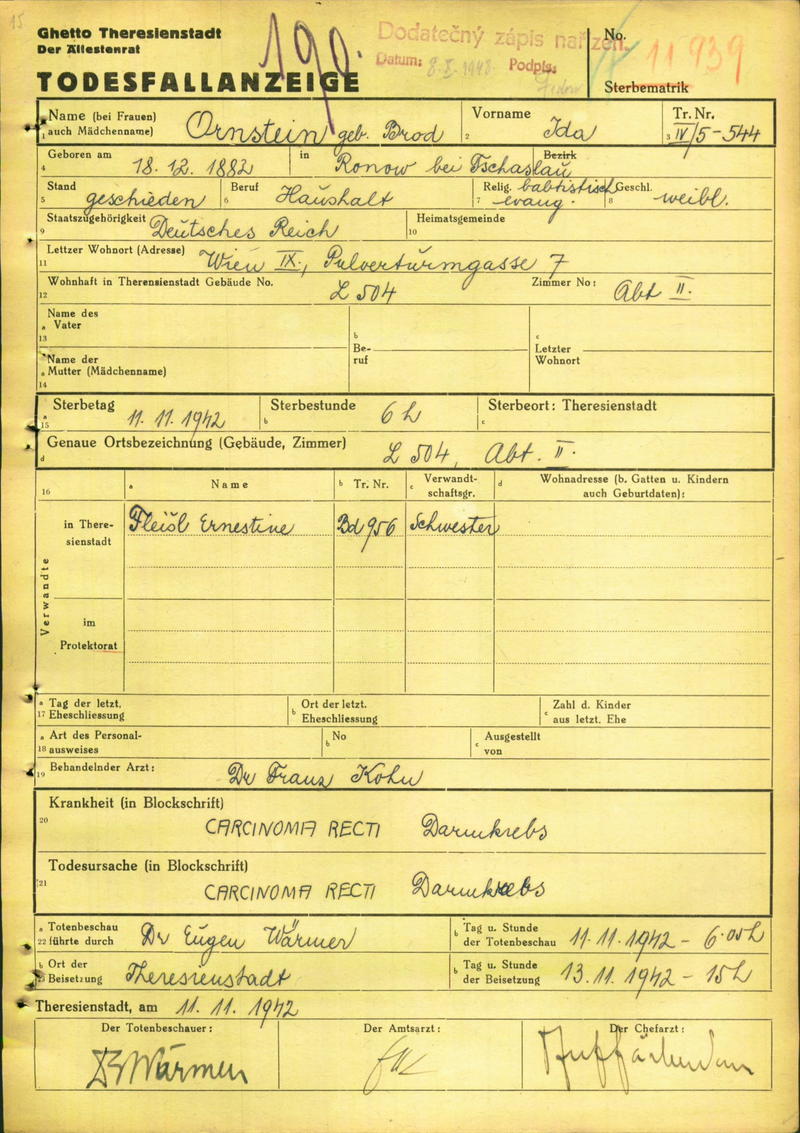 Ornstein Ida: Oznámení o úmrtí, ghetto Terezín