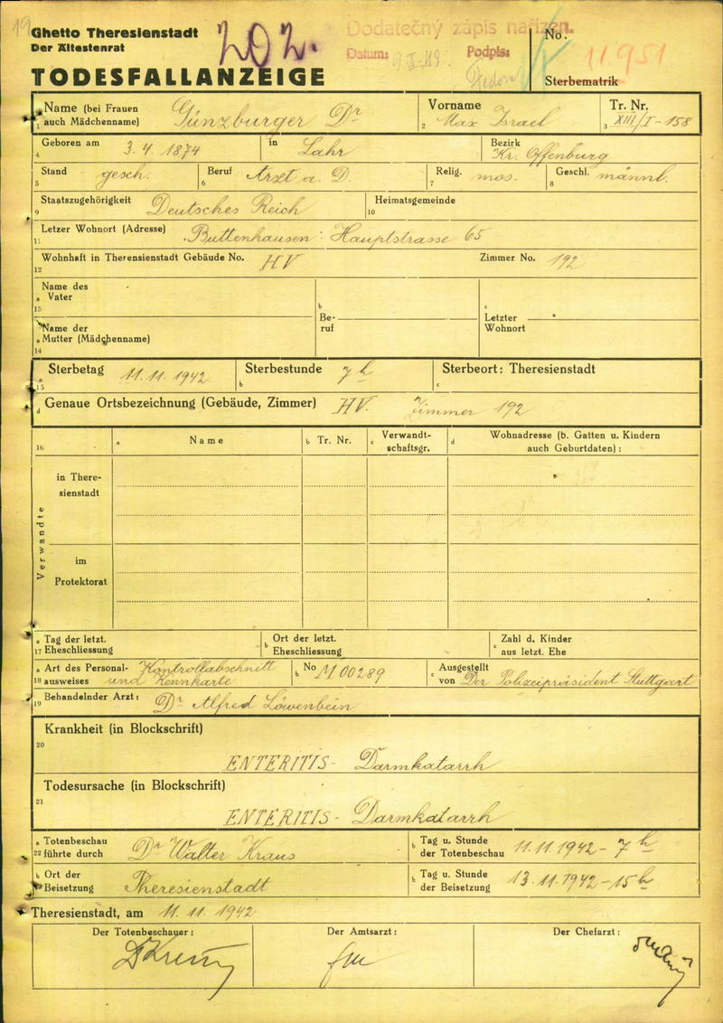Günzburger Max: Oznámení o úmrtí, ghetto Terezín