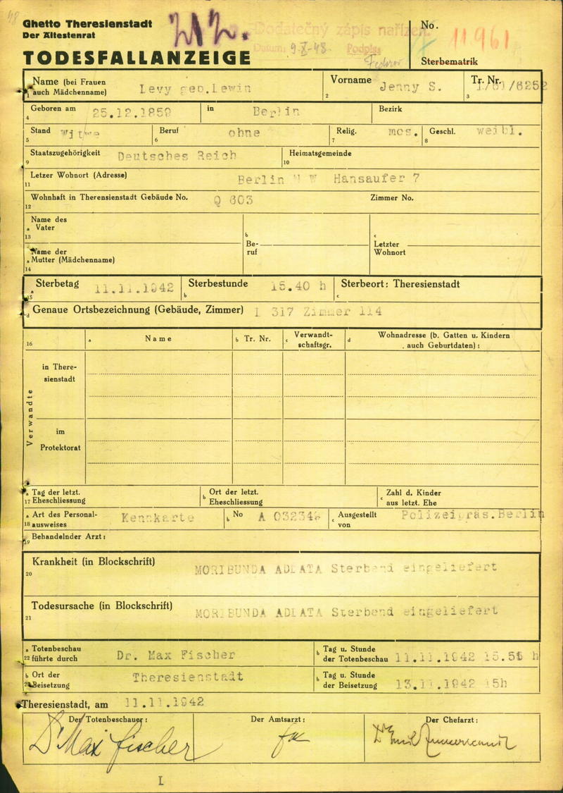 Levy Jenny: Oznámení o úmrtí, ghetto Terezín