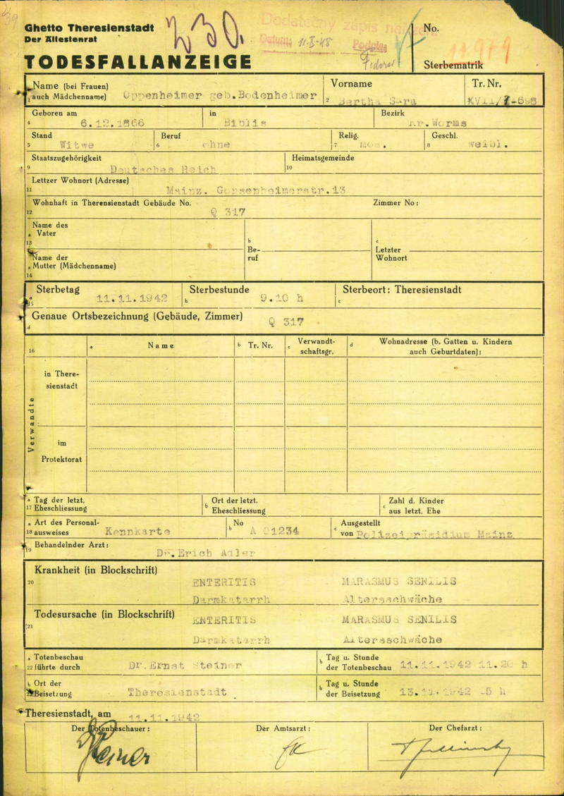 Oppenheimer Berta: Oznámení o úmrtí, ghetto Terezín