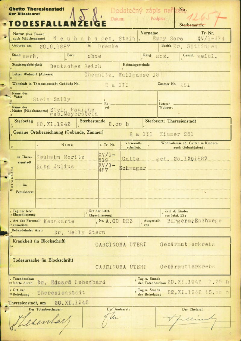 Neuhahn Emma: Oznámení o úmrtí, ghetto Terezín
