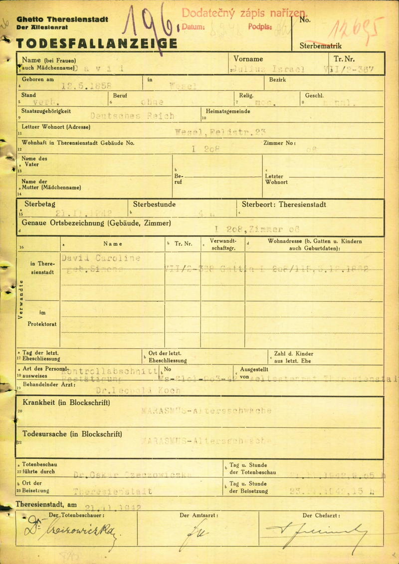 David Julius: Oznámení o úmrtí, ghetto Terezín