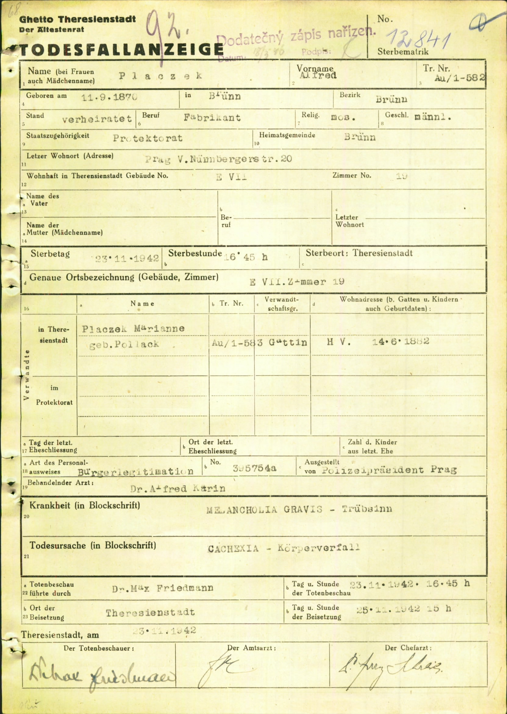 Placzek Alfred: Todesfallanzeige, Ghetto Theresienstadt