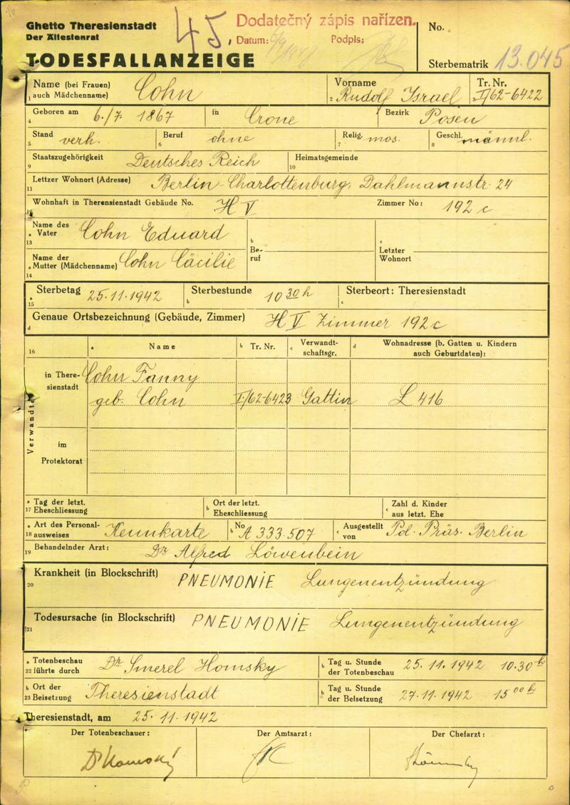Cohn Rudolf: Oznámení o úmrtí, ghetto Terezín