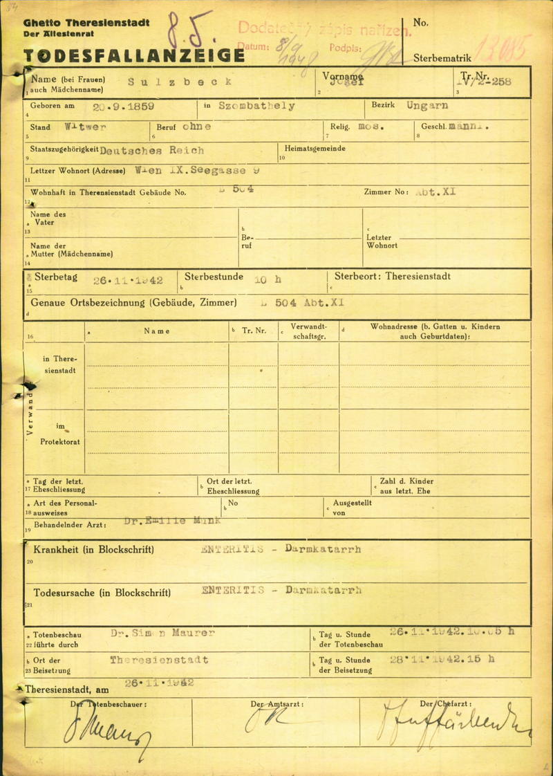 Sulzbeck Josef: Oznámení o úmrtí, ghetto Terezín