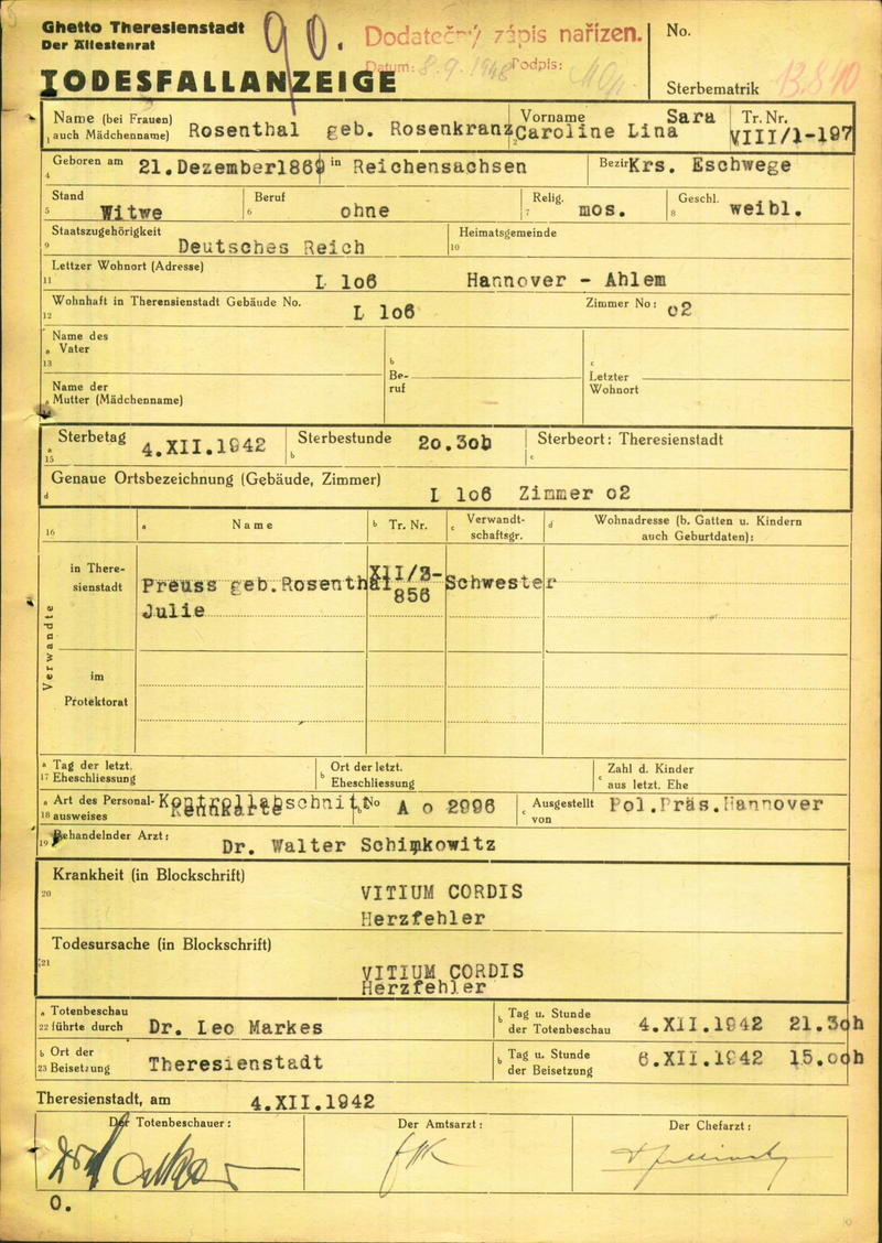 Rosenthal Karoline: Oznámení o úmrtí, ghetto Terezín