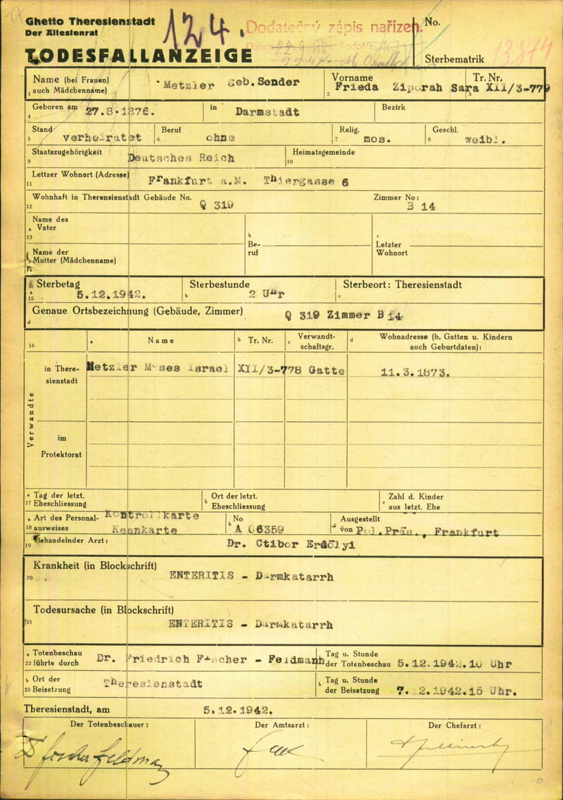 Metzler Frieda Zipora: Oznámení o úmrtí, ghetto Terezín