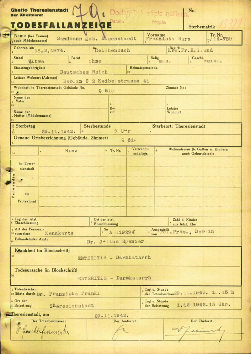 Sandmann Franziska: Oznámení o úmrtí, ghetto Terezín