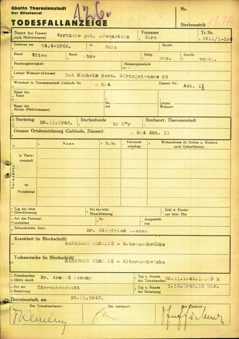 Wertheim Sara: Oznámení o úmrtí, ghetto Terezín