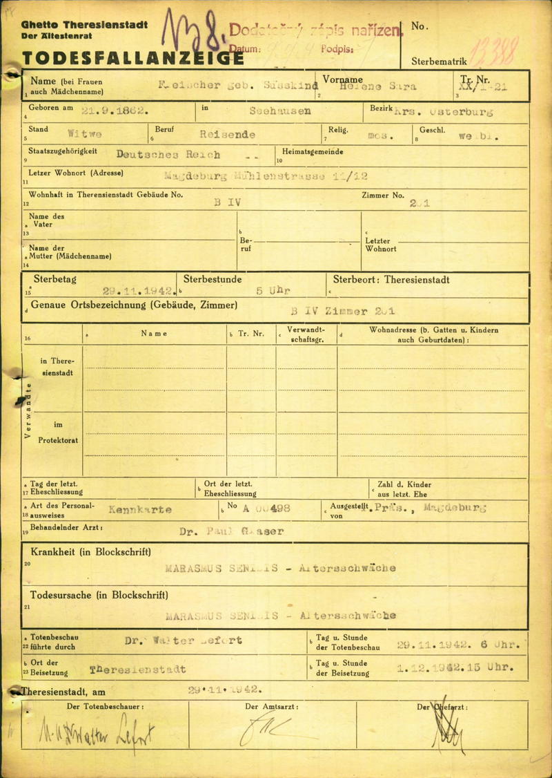 Fleischer Helene: Oznámení o úmrtí, ghetto Terezín