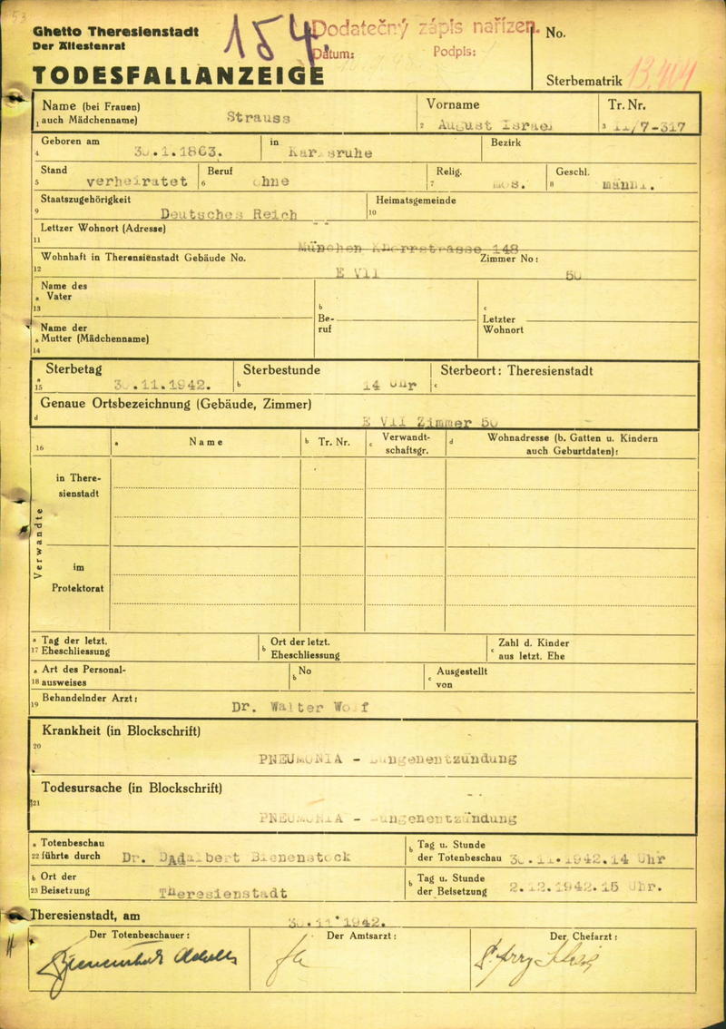 Strauss August: Oznámení o úmrtí, ghetto Terezín
