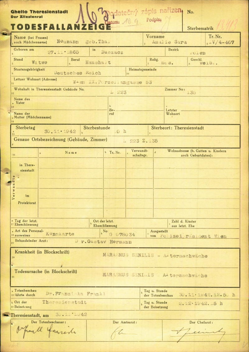 Neumann Amalie: Oznámení o úmrtí, ghetto Terezín