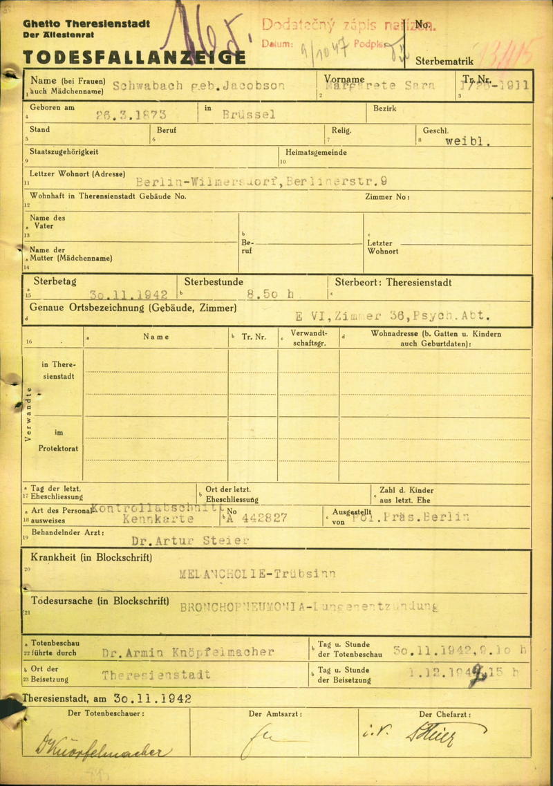 Schwabach Margarethe: Oznámení o úmrtí, ghetto Terezín