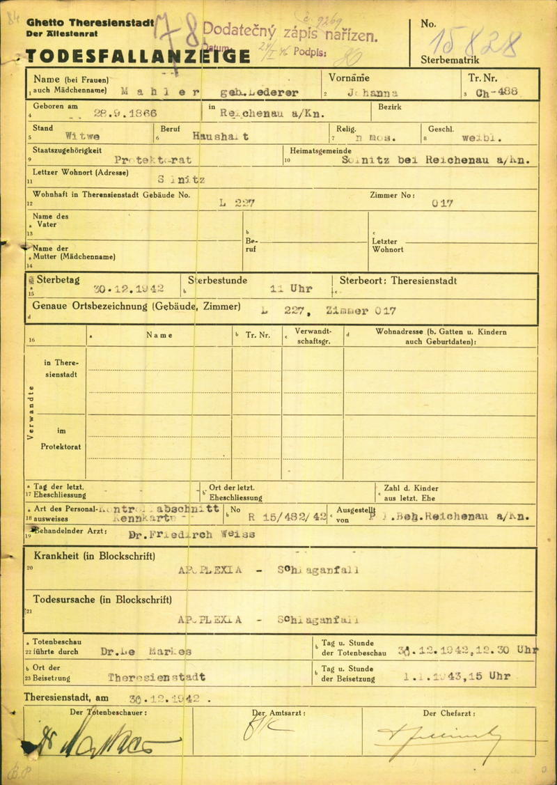 Mahlerová Johanna: Oznámení o úmrtí, ghetto Terezín