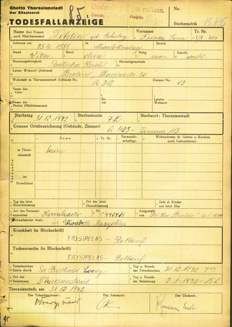 Tiktin Frieda: Oznámení o úmrtí, ghetto Terezín