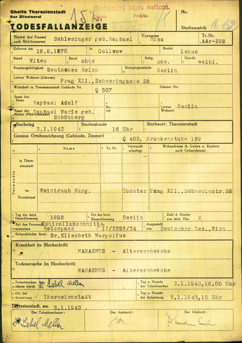 Schlesingerová Růžena: Oznámení o úmrtí, ghetto Terezín