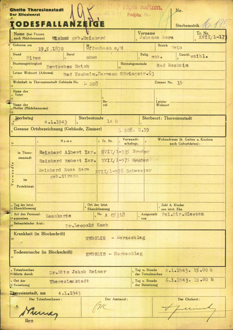 Minkus Johanna: Oznámení o úmrtí, ghetto Terezín