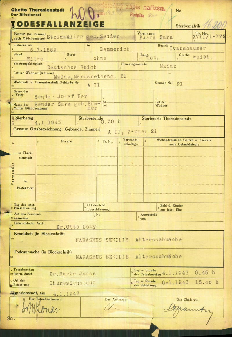 Steinmüller Clara: Oznámení o úmrtí, ghetto Terezín