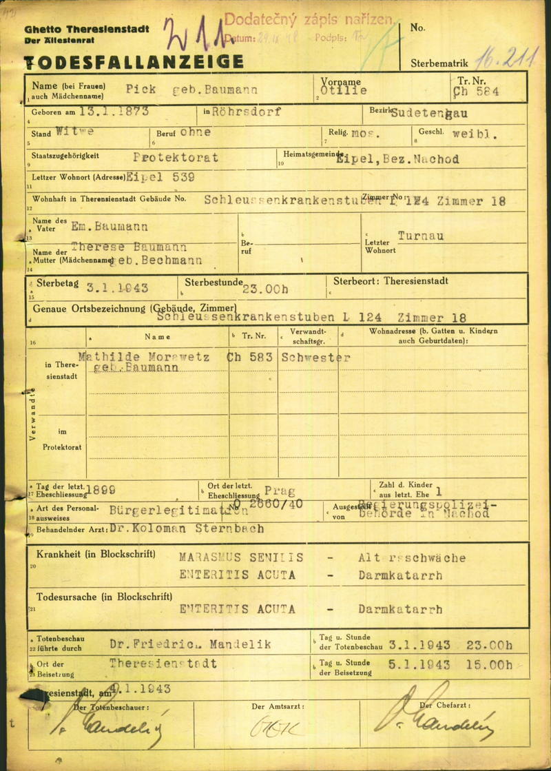 Picková Otilie: Oznámení o úmrtí, ghetto Terezín